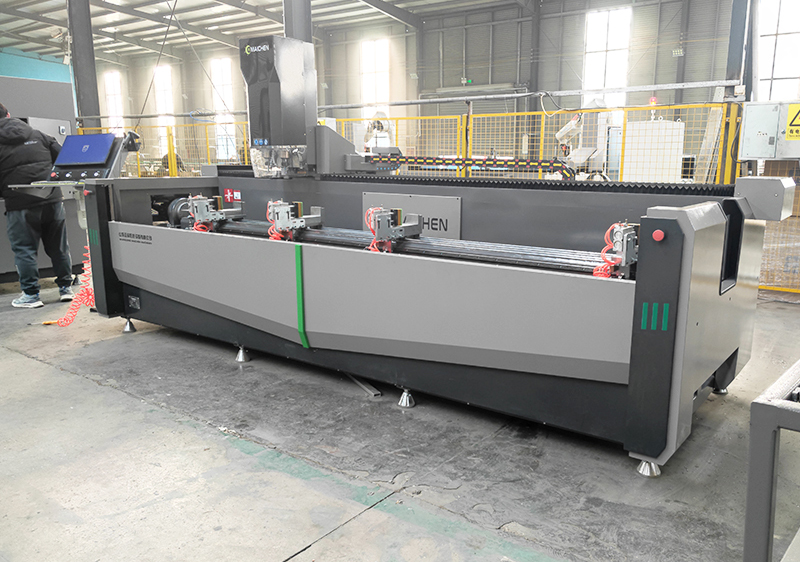 Фрезерно-сверлильный станок с ЧПУ для алюминиевых профилей использует систему Han и оснащен 8-осевым ЧПУ, обеспечивает сервоприводное перемещение рабочего стола, автоматическое предотвращение застревания зажимных приспособлений, имеет память сервоприводов и программное обеспечение для оптимизации стыковки. Подходит для обработки алюминиевых оконных и дверных профилей, а также алюминиевых профилей для навесных стен.